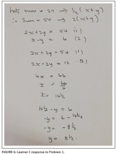 The small number of participants who demonstrated level 2 and level 3 modelling competencies for each of Problems 1-5 appeared to have understood appropriate facets supplied in each of the problems allowing them to mathematise relevant quantities and their relations for each problem. This also enabled these few participants to correspondingly construct meaningful mathematical models represented by a system of linear equations. Participants at level 2, however, apparently did not possess the required abilities to solve the system of linear equations built by them. For example, in respect of Problem 5, learner 15 correctly constructed his system of linear equations 2x + y = 56 and x + 2y = 82 to get 3x + 3y = 138 by means of addition. Unfortunately, he then erroneously simplified it to x + y = 15 and then ceased working. Similarly, learner 11 mistakenly condensed the same system of linear equations 2x + y = 56 and x + 2y = 82 to x + y = 26 instead of −x + y = 26 by means of subtraction and ended abruptly. These chosen strategies indicate a collapse in terms of solving systems of linear equations properly and fully. The sudden endings at particular phases during the calculations again indicate that level 2 participants did not interpret their answers to verify whether such answers were meaningful or not. The few participants who revealed level 3 modelling competencies, however, efficiently solved their systems of linear equations to obtain the precise solutions.