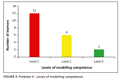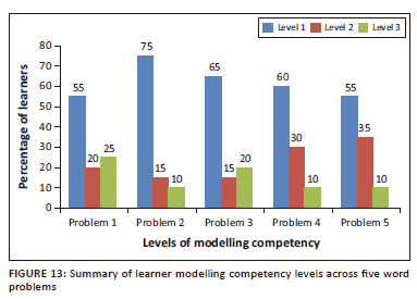 The findings centre on participating learners' replies that deal with their modelling abilities shown while solving five contextual problems. The discussion is structured in terms of learners' abilities extending through three levels as indicated formerly, namely level 1 (incompetent), level 2 (moderately competent), and level 3 (competent). Figure 13 is a representation of the findings that reveal the majority of participants' (fluctuating from 55% to a maximum of 75%) proficiency to be on level 1. A small percentage (from 20% to 35%) of the participants managed to achieve level 2. Those who performed on level 3 ranged from 10% to 25% through the five problems.