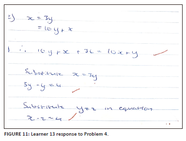 With hindsight, the small number of participants who revealed level 3 abilities by successfully engaging with and solving Problems 1-5 grasped the essence of the problem, identified the crucial and pertinent numerical values, and managed to allocate variables appropriately and in alignment with the 'simultaneous equation' approach. These specific participants built eloquent relationships between the variables as systems of algebraic linear equations for each problem, and solved them accurately. The majority of participants, though, abruptly finished what they were doing once they established the numerical values of variables x and y. Very few participants managed to elucidate the respective values of x and y by reaffirming the meaning assigned within the context of the problem. As illustration, learner 12 in the case of Problem 5 clearly acknowledged that x = 36 is connected to the age of the father and that y = 10 is connected to the age of the son. Learner 1, in a more agreeable way, reflected on his initial assumption that the two-digit number was in the form xy. He also fittingly integrated values y = 2 and x = 6 derived through solving his system of linear equations simultaneously to configure that the two-digit number was equal to 26. In this case the participant exhibited awareness, understanding and an adequate level of explanation and clarification of the solution. Similarly to the majority of participants in this group, however, learner 1 made no effort to verify whether the values of x and y would satisfy the conditional statements governing Problem 4.