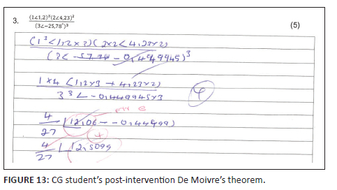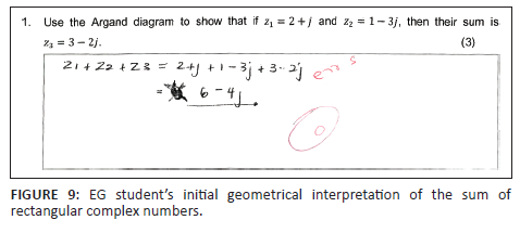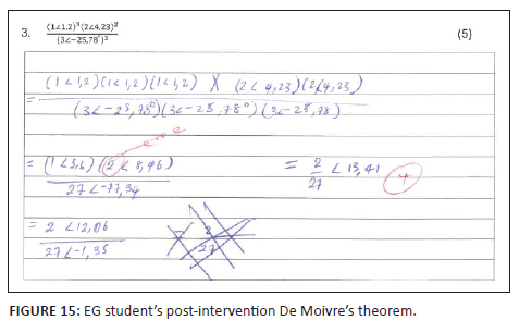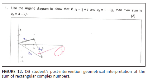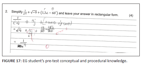 and (1.3 < -60°) must be converted to rectangular form. The student's mark improved from 0% (0 out of 4) to 50% (2 out of 4), hindered by inappropriate problem representations and conversions hinting at conceptual and procedural deficiencies. In contrast, some EG students (see Figure 15 and Figure 16) showed what Smith et al. (2019) call 'expert-like behaviours'. The visual and enablement of GeoGebra helped the students connect the rectangular and polar forms of complex numbers (see Figure 4). Students could conceptualise the two forms of complex numbers as just two ways of expressing the same complex number, no longer seeing the two representations as two autonomous and separate entities as observed in Panaoura et al. (2006)'s study, enhancing conceptual and procedural knowledge as postulated by Haapasalo (2003), freeing the student to manipulate within and move between the different forms, identifying the most appropriate form (see Figure 15 and Figure 16). The student correctly represented the problem, navigated the rectangular, exponential, and polar forms, and converted these different representations into the rectangular form. This shows that the GeoGebra-enriched intervention enhanced students' conceptual and procedural knowledge by merging the three other forms and representations, thus demonstrating an understanding that a complex number is one coherent mathematical entity. The student switched from the exponential, algebraic, and polar forms,