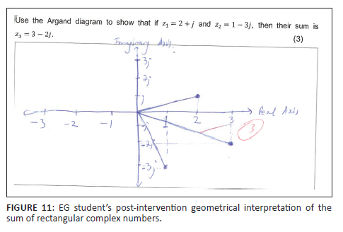 The lecturer-researcher guided the EG and CG students in the geometric interpretation meaning of the sum of rectangular complex numbers. Subsequently, the two sample students used different approaches. However, what is worth mentioning is the students' preferences in the post-test, the noticeable power and influence of GeoGebra's visualisation, and enablement affordance in EG students. The EG student's approach (see Figure 11) mimics GeoGebra's modelling approach (see Figure 3).