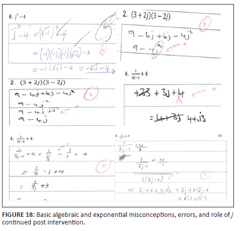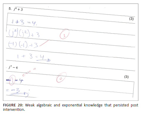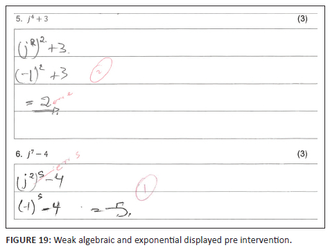Some students, in both the EG and the CG, displayed fragmented basic algebraic and exponential knowledge and misconceptions before and after the intervention (see Figure 19 and Figure 20). In addition, one of the students correctly represented j4 + 3 as (j2)2 + 3 and correctly substituted j into (j2)2 + 3 to get (-1)2 + 3 in the pre-test (see Figure 19). However, weak exponential knowledge made the student believe that (-1)2 = -1, resulting in a drop of 33.33% marks for this test item. The same student wrote j7 - 4 = (j2)5 - 4 = (-1)5 - 4 = -5 in the pre-test (see Figure 19). Although the student corrected j4 + 3 and improved the marks for this test item from 66.67% (2 out of 3) to 100% (3 out of 3), the marks dropped by 33.33% in the other test item in the post-test (see Figure 20). In particular, the student wrote j7 -4 = -1 - 4 = -3. The student's marks for these two items remained at 50% (3 out of 6) in the tests, and it could have been better in both tests had it not been for prevailing misconceptions and weak algebraic knowledge, as highlighted above.