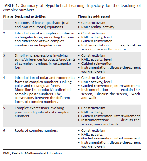 Phase 1, a precursor for introducing a complex number in phase 2, was conventionally underpinned by constructivism and the reality and activity approaches of RME. The introduction of complex numbers in phase 2 was further driven by Driver and Tarran's (1989) expediency approach (using a number system and the need to solve polynomial equations). The reality principle of RME includes personally meaningful activities (Drijvers, 2012), and therefore expediency approach supports it because students are familiar with solutions to quadratic equations (DBE, 2011). Furthermore, Ndlovu (2013) stresses that mathematics learning must include personally meaningful mathematics contexts to enhance conceptual knowledge. GeoGebra-facilitated activities were exploited to lessen complex numbers' abstraction and allow students to see, explore, and engage. GeoGebra helps students to see abstract concepts (Antohe, 2009).