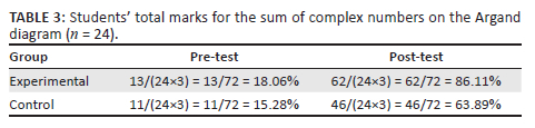 Table 3 shows students' total marks for the test item on the sum of complex numbers on the Argand diagram.