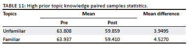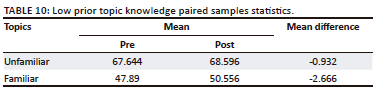 It is possible that the data might be conflated in terms of those topics that were new to both groups. To investigate this possibility, data for only those topics that were new to both high and low prior knowledge groups were analysed separately and were then compared with an analysis of data for the 'familiar' topics. A paired samples test was utilised for this purpose. It should be noted that not all the statistics are presented in the tables other than those that are relevant for the discussion. Table 10 shows the analysis for the low prior knowledge group whereas Table 11 shows the analysis for the high prior knowledge group and Table 12 shows the analysis for all participants.