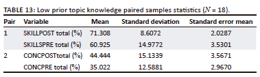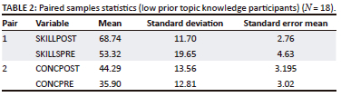 The findings also indicate that there was significant enhancement of the competency of conceptual understanding for both groups post-intervention. The low prior topic knowledge participants however still had a mean below the pass cut-off (44%) whereas the high prior topic knowledge group improved to close to 70%. The difference between the groups also increased for this competency signifying that the low prior topic knowledge group was still at an early developmental stage for this competency.