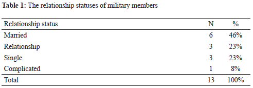 Of the individuals involved in the repatriation, 13 agreed to participate in the study. Although this was a small number of participants, it should be noted that there were very few SANDF members required for the repatriation and quarantine mission. The military members were predominately males (85%). The ages of the military members ranged from 29 to 55 years with a mean age of 39 years. The indicated race groups were African (77%) and White (23%). The majority of the languages indicated were Sepedi (23%), English (15%) and Setswana (15%). Only three of the nine provinces in South Africa were represented, namely Gauteng (77%), Mpumalanga (8%) and North-West (8%). The highest education of the repatriated military members ranged from Grade 12 to a master's degree, with the majority of the military members having a bachelor's degree (31%). The occupations listed by the military members included military practitioners, nurses, a psychologist, a social worker and a few military officers. The relationship statuses of the military members are indicated in Table 1. The majority of the staff were married (46%). In terms of the number of dependants listed by the military members, this ranged from none to 7 dependants. The type of dependants was identified as both financial and emotional (31%) and only financial (39%).