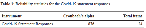 In Table 3, the reliability statistic is indicated for the Covid-19 statements. A Cronbach's alpha of .876 suggests that these 24 Covid-19 statements were sufficiently reliable (see Nunnally & Bernstein, 1994).