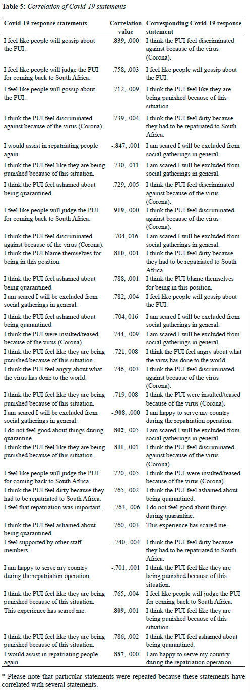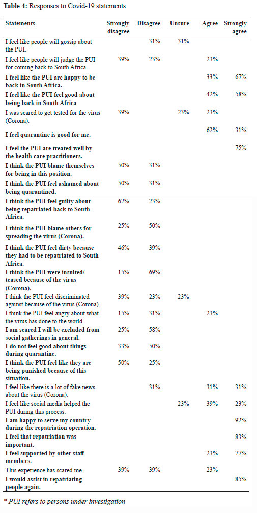 In Table 4, the frequencies of responses chosen by the military members are indicated. It should be noted that only the highest percentages are shown in the table to illustrate the predominant responses. In general, the 'unsure' answer option was only used to a small extent as military members appeared to have a clear idea of whether they agreed or disagreed with the statements. There were some statements that showed a very clear pattern of agreement and disagreement by military members. These sentences were bolded to show how clearly military members responded to these statements. When assessing the content of the statements and the responses by military members, it became very apparent that an overwhelming sense of positivity and dedication was indicated in their responses. The responses to quarantine, repatriation and the perception of PUI's feelings suggest that the military members experienced the Covid-19 repatriation and quarantine as an important task that they were confident to execute. It is however worth noting that there was a smaller percentage of military members that were not as positive and had some doubts regarding the perception of PUI's feelings and quarantine.