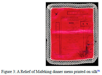 The author's research on the Relief of Mafeking dinners led to the discovery of a menu printed on silk (see Figure 3). The content of the menu is not, however, clear.