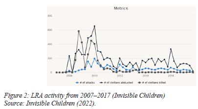 • metrics gathered by Invisible Children, which included numbers and locations of LRA attacks and abductions since 2008 (Invisible Children, n.d.); and