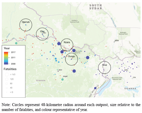 2 The distance of 30 miles (48 kilometres) was chosen based on an average two-day walking distance, assuming an LRA fighter would be capable of 12 hours of daily movement. The distance rate was determined using the American Army Techniques Publication 3-90.98, Jungle Operations (Washington, D.C.: Department of the Army, 2020:156).