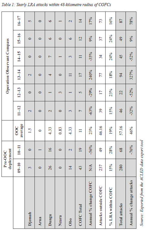 These trends continued throughout the duration of OOC. As seen in Table 1, COFCs had a stronger decline in LRA violence year-over-year than areas outside the 48-kilometre radius "security bubble". Even in years where LRA attacks saw a rise, the COFCs had a dampening effect that led to a much smaller increase. For instance, while 2013-2014 saw a 327% increase in reported LRA attacks, areas inside the security area of the COFCs suffered a 240% increase. Additionally, 2016-2017, the final year of the American deployment, saw a 78% increase in attacks across the overall area of operations, with only a 17% increase in areas within 48 kilometres of COFCs.