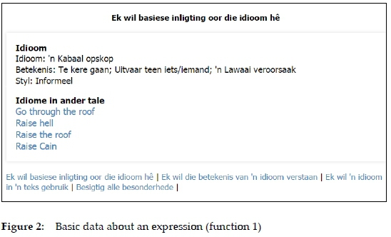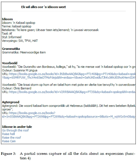 Figure 2 shows the basic data for the expression kabaal opskop (go through the roof) (function 1) which includes the following fields: expression, meaning, style and related expressions in English. Figure 3 shows all the data for this expression (function 4) and includes all the fields in the database that may be of interest to a user (fields for the editor's usage are not displayed).