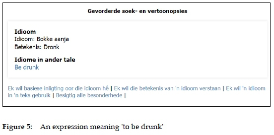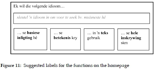 Figure 1 shows the homepage of the Afrikaanse idiome-woordeboek and the five functions are given underneath the basic search field.