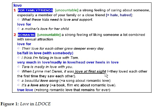 The visual mode, including color, font, symbol and notation, can also be properly used to reinforce the ideational meaning. Figure 1 shows a part of the love entry in Longman Dictionary of Contemporary English (LDOCE). Several semiotic resources are used to reinforce the representation of collocation and idiomatic usage, like highlighting such an expression in its examples with an underline and boldface font when the mouse cursor hovers over it (see "love at first sight" in Figure 1). During this multimodal human-computer interaction, the solid line emerges, which may imply a lexical bundle as cross-modal metaphor. Its emerging process might give some readers a sense of formation of the bundle.