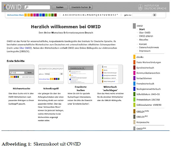 OWID, die Online Wortschatz Informationssystem Deutsch (aanlyn woorde-skatinligtingstelsel van Duits) van die Institut für Deutsche Sprache bied die volgende openingsblad ter aanduiding van hulle woordeboekportaal - met 'n aanduiding van die verskillende woordeboeke in die kolom aan die regterkant: