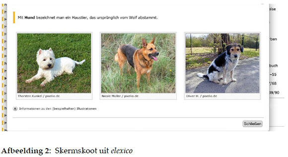 Die veranderende verhouding tussen leksikografie en tegnologie het 'n invloed op talle aspekte van die leksikografie en die leksikografiese proses; ook op die benutting van korpora. Ook die omvang van die toekomstige gebruik van lek-sikografiese korpora sal aangepas word. In sy bespreking van korpora noem Fuertes-Olivera (2012: 51) onder meer dat 'n leksikografiese korpus 'n versameling tekste is. Tarp en Fuertes-Olivera (2016: 277) noem dat die internet ook 'n versameling tekste is en ook as 'n tipe leksikografiese korpus beskou kan word. Leksikograwe vul reeds die gebruik van tradisionele korpora aan deur die internet as korpus te gebruik vir die vind van 'n verskeidenheid datatipes, ver-gelyk onder meer Tarp en Fuertes-Olivera (2016). Die leksikograaf is steeds die voorsiener van tersaaklike data en hierdie data word deur die leksikograaf gekies en as aanduiders in die woordeboek verstrek - dikwels met erkenning aan die internetbron waaraan die data onttrek is. Vergelyk in hierdie verband afbeelding 2 - die aanlyn woordeboek elexico se illustrasieprente wat foto's is wat op die internet gevind is. In hierdie geval is dit aan die gratis prente-databank pixelio.de onttrek en hierdie bron word deur die leksikograaf erken.