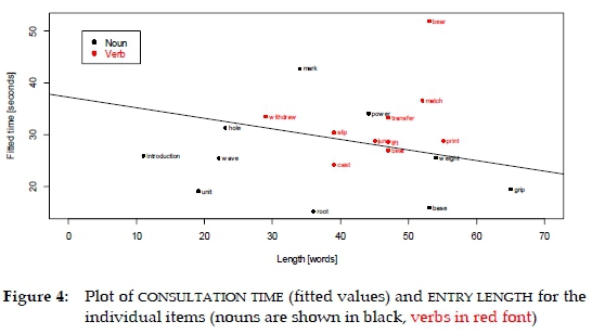 In Figure 4,we plot the relationship between entry length and consultation time for the individual test items (for consultation time, these are unlogged fitted values). The slope is not significantly different from zero (p = 0.15, n.s.), which suggests consultation time is not related to entry length; this may be seen as somewhat surprising: a longer entry might be expected to require longer study time due to its sheer length. in addition, a longer entry could also mean that the lexical item itself might be a more challenging one, and that might again be expected to require longer consultation. No such effect, however, is evident in our data, and there is in fact a (non-significant) hint of a reverse trend.