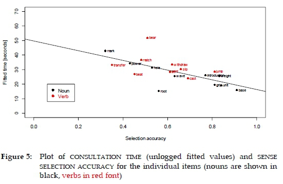 (6) whether sense selection accuracy of lexical items is related to consultation time; we would expect a negative correlation, with longer times corresponding to lower accuracy; both being expected consequences of increased item difficulty.