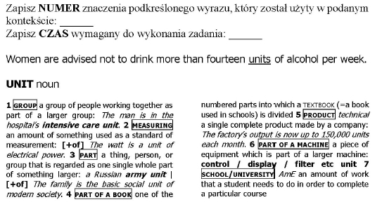 The test was administered in a classroom by the first author, in five groups of between fifteen and twenty students in each session, over the course of one week. Before the actual test, each group received step-by-step instructions on how to proceed. The instruction was delivered verbally from a printed script in polish, the native language of all participants. The subjects were told in their native language that they were expected to read the cue sentence. The cue sentences provided the subjects with some context in the target language and an underlined word (the target item), which appeared in a less-known sense (see Appendix A and B). Subsequently, they were instructed to identify the target item and its context, search for the meaning of the underlined target word (the target items in the cue sentences were provided with a dictionary entry underneath the cue sentences: see Appendix A and B), write down on the test sheet the number of the target sense in which the target item is used, record their own time and move on to the next task item. The participants were informed that each test had twenty test items on separate sheets and that there were no time restrictions for the completion of the test. Participants recorded their own time using the stopwatch function of their mobile phones (it would not be possible for the experimenter to record twenty participants at the same time, and the school only allowed testing in groups). The next step was a complete practice run on two items (these were not used in the data analysis), followed by the actual testing.