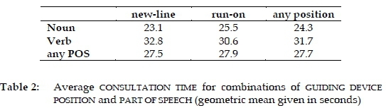 The grand (geometric) mean for consultation time, averaged across all entry look-ups, was 27.7 seconds. When broken done by part of speech and guiding device position, the (geometric) means pattern as in Table 2.