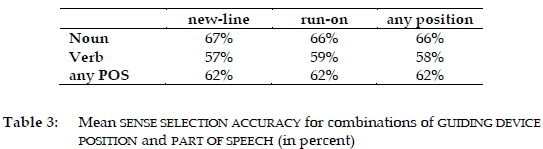 In terms of sense selection accuracy, the grand mean was 62 percent, and it was exactly the same in the case of run-on and new-line entries. Nouns exhibited a somewhat higher mean accuracy (66 percent) than verbs (58 percent). Broken down by part of speech and guiding device position, the means patterned as in Table 3.