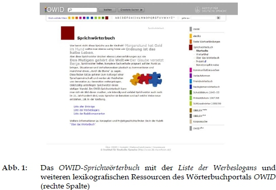 Lexikografische Online-Ressourcen zur deutschen Sprache werden beispielsweise vom Dudenverlag (Duden Onlinewörterbuch), von der Union deutscher Akademien (z. B. DWDS, Wörterbuchnetz u. a.) und auch am Leibniz-Institut für Deutsche Sprache in Mannheim (OWID) (vgl. Klosa-Kückelhaus und MüllerSpitzer 2019: 418f.) erstellt. Im Wörterbuchportal OWID (Online-Wortschatz-Informationssystem Deutsch), das sich auf Ressourcen zu spezialisierten Wortschatzbereichen konzentriert" (ebd.), stehen den User/-innen zehn lexikogra-fische Ressourcen zur Verfügung (Stand März 2021)2, darunter auch das OWID-Sprichwörterbuch, eine korpusbasierte und nach Kriterien der wissenschaftlichen Lexikografie erarbeitete Dokumentation aktuell gebräuchlicher fester Sätze der deutschen Sprache - im Kern Sprichwörter" (OWID-Sprich-wörterbuch)3(Abb. 1). Ins Sprichwörterbuch wurde zuletzt das Modul Werbeslogans (Steyer und Polajnar 2015) integriert. Hierbei handelt es sich um die lexikografische Beschreibung des aktuellen Korpusgebrauchs von Werbeslogans, die in der Gemeinsprache eine gewisse Geläufigkeit aufweisen. Da diese Slogans ähnlich wie Sprichwörter funktionieren, wurden sie nach demselben Modell (Steyer 2012; Steyer und Durco 2013; Durco, Steyer und Hein 2017) mit einigen Änderungen in der Wörterbuchartikel-Struktur beschrieben und in das Sprichwörterbuch integriert. Die Slogan-Artikel zeigen nicht nur, wie lebendig und variabel Werbeslogans in außerwerblichen Kontexten sind und wozu Sprecher/-innen sie benutzen, sondern auch, dass die Werbesprache eine moderne Quelle für die Entstehung neuer Sprichwörter darstellt.