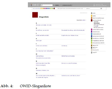 Im Modul Werbeslogans sind nur solche satzwertigen Werbeslogans vorzufinden, die sich bereits von ihrem Ursprungskontext (Produktwerbung) entfernt haben und eine Tendenz zum Weisheitssatz" aufweisen. Hierbei wurden in der OWID-Sloganliste (Abb. 4) Werbeslogans aus unterschiedlichen Jahrzehnten des 20. und 21. Jahrhunderts lexikografisch erfasst:
