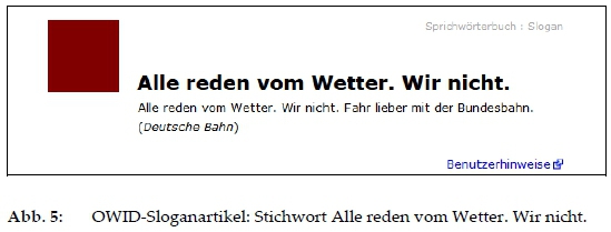 Bedeutungsbeschreibung fällt dann anspruchsvoller aus, wenn ein Slogan überwiegend in den Kontexten vorkommt, die noch stark mit der Domäne Werbung verknüpft sind. In einigen Fällen konstituiert sich die abstrakte Bedeutung erst auf der Musterebene. So ist die Verwendung des DeutscheBahn-Slogans Alle reden vom Wetter. Wir nicht. stark an den Wetter-Kontext gebunden. Erst durch die Ersetzung des Lexems Wetter durch andere Nomina wie Rezession oder Benzinpreise lässt sich eine generelle Bedeutung festschreiben: Sagt man dafür, dass man anders handelt als die Mehrheit und damit vom Gängigen abweicht." (SWB-SL)