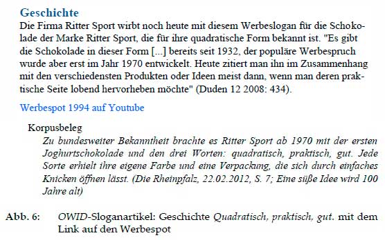 In diesem Teil des Slogan-Artikels werden also Informationen zur Entstehung des Werbeslogans aus Sekundärquellen gegeben (Nachschlagewerke, Webportale und einschlägige Webseiten usw.). Angereichert werden diese Texte durch DEREKO-Belege, in denen die Entstehung oder der Ursprungskontext des jeweiligen Slogans explizit thematisiert wird und Werbeslogans in Zitatform gebraucht werden. Dadurch unterscheidet sich auch der Korpusgebrauch von Slogans in diesen Belegen vom Korpusgebrauch in allen weiteren Belegen, da hier der Werbeslogan noch keine usuelle, situationsunabhängig-abstrakte (nicht-werbliche) Kernbedeutung aufweist, wie sie in weiteren Teilen der Slogan-Artikel genau beschrieben wird (siehe f). Zudem liegen hier Links auf Youtube-Videos mit den Originalwerbespots (wenn vorhanden) vor. Beim Werbeslogan der Firma Ritter Sport Quadratisch, praktisch, gut. werden in dieser Rubrik eine Vorgeschichte samt Werbespot und ein Beleg, der auf die Werbung rekurriert (Abb. 6), dargestellt: