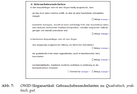 6 Die Adaption der musterbasierten Korpusmethodlogie für Slogans und ihre lexikografische Beschreibung im Modul Werbeslogans im OWID-Sprichwörterbuch wurden in Kooperation mit dem Projekt Usuelle Wortverbindungen (Leitung: Dr. Kathrin Steyer) während mehrerer Forschungsaufenthalte seit 2009 am Leibniz-Institut für Deutsche Sprache erarbeitet.