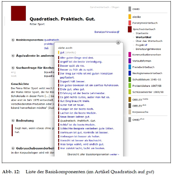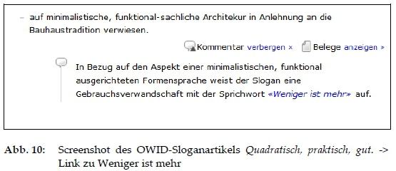 Bestimmte Slogans werden direkt mit jenen Sprichwortartikeln (SWB) verlinkt, mit denen sie in einem wie auch immer gearteten Verwendungszusammenhang stehen (vgl. Abb. 10):