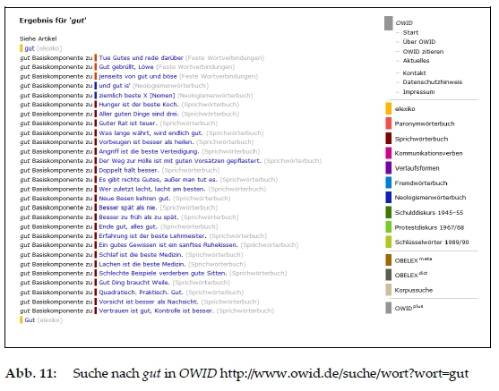 Durch die Auszeichnung der Basiskomponenten wird zum einen eine Ver-linkung zu dem entsprechenden Einwort-Artikel in elexiko hergestellt, zum anderen kann die OWD-Suche auf die Basiskomponenten zurückgreifen. So erhält man beispielsweise bei der Komponente gut folgende Suchergebnisse (Abb. 11).