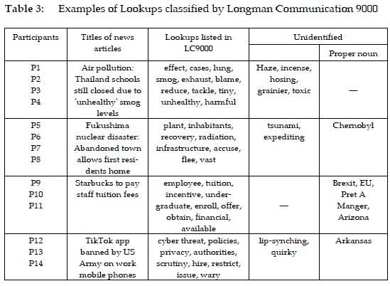 Taking the titles of articles into consideration, it is obvious that many of the lookups that are classified as unidentified are proper nouns or words that are specially related to the specific topics the participants chose to read. For example, the words "haze, incense, hosing, and toxic" were searched by students as these words are related to the 'toxic haze that can be reduced by hosing down the streets and not burning incense'. The proper nouns "EU, Arizona, Brexit, Pret a Manger" were looked up as it specifically discussed about 'recruitment problems Pret a Manger may encounter after Brexit from the EU'