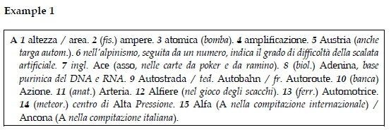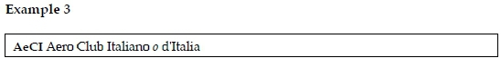 As seen from example 2, within the dictionary entry in expansion 4, i.e. 4 Aero Club Italiano o d'Italia = AeCI (Italian Aero Club or Aero Club from Italy), there is the occurrence of two expansions of the same concept, namely Aero Club Italiano (Italian Aero Club) and Aero Club d'Italia (Aero Club from Italy) followed by the abbreviation that is also used in Italian for this concept after the symbol =, i.e. = AeCI. In example 3 we notice some inconsistency in providing the cross-reference, as the abbreviation ACI is not mentioned within the dictionary entry.