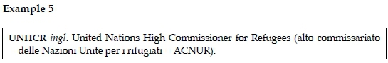 Within the dictionary entries we notice Italian and foreign abbreviations, in example 4 we notice the introduction of an Italian abbreviation, ACNUR that was originally English, i.e. UNHCR. As seen from the dictionary entry the expansion in Italian is followed by the symbol = and the original abbreviation UNHCR. A cross-reference is also provided as seen in example 5, where some inconsistency in spelling, namely the uppercase letters, i.e. Alto Commissario and Rifugiati (High Commissioner and Refugees) in example 4 vs the lowercase letters, i.e. alto commissariato and rifugiati (High Commissariat and Refugees) in example 5 as well as the occurrence of two different nouns, namely Commissario (Commissioner) and commissariato (Commissariat) is visible.