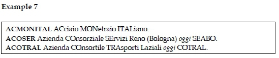 In example 7 we encounter examples of acronyms, i.e. ACMONITAL ACciaio MONetraio ITALiano (name of a company), clipped to the first two or three letters. Such type of formation of abbreviations also used to be popular in Slovenia, i.e. Beti, Nama, etc. (Glozancev 1980). In example 7 we also notice the occurrence of acronyms that are outdated and at present a different abbreviation is used and introduced within the dictionary entry with the word oggi, (today), i.e. ACOSER Azienda COnsorziale SErvizi Reno (Bologna) oggi SEABO (name of a company), and ACOTRAL Azienda COnsortile TRAsporti Laziali oggi COTRAL (name of a company). Cross-references are ensured as both abbreviations, namely COTRAL and SEABO, are included as separate dictionary entries.