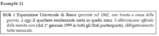 In example 11 we notice the occurrence of historically labelled abbreviations, namely in the first expansion, i.e. 1 Esposizione Universale di Roma (prevista nel 1942, non tenuta a causa della guerra) (Universal Exposition of Rome, scheduled for 1942, not held due to war), where an explanatory sentence is provided stating that the event was never performed, but the abbreviation was still used enough to be included in the present dictionary. Within the second expansion, i.e. 2 oggi il quartiere residenziale sorto in quella zona (today the residential district built in that area), we notice the time qualifier oggi (today) and an explanatory sentence stating that the abbreviation EUR meant the Universal Exhibition in Rome, Esposizione Universale di Roma but was transferred to the present residential area of the aforementioned exhibition. The expansion denoting the currency, in use in Italy since 1999, is only placed as the 3rd expansion, 3 abbreviazione ufficiale della moneta euro (dal 1° gennaio 1999 in tutti gli Stati partecipanti), obbligatoriamente tutta maiuscola (official abbreviation of the euro currency, since 1 January 1999 in all participating countries, compulsory all upper case letters). We notice that the number is not written in bold and we also notice a long explanatory sentence providing information about the official abbreviation of the euro currency, followed in brackets by some additional information stating that the currency was adopted by all participating countries on the 1st January 1999 and followed by an orthographic remark, i.e. obbligatoriamente tutta maiuscola (compulsory all upper case letters) stating that the abbreviation is obligatorily written in upper case letters.