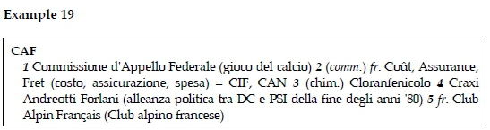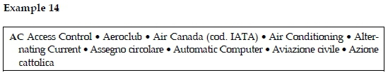 As seen in example 14 there are also foreign expansions present within the dictionary entry, for English, i.e. Air Conditioning, Alternating Current, etc. and for Italian, i.e. Aviazione civile (Civil Aviation), Azione Cattolica (Catholic Action), but there is no information concerning the language qualifier prior to the expansion and also no translation of the foreign expansions into Italian and no explanations. Those were all elements that we encountered in Righini's dictionary (2001). In Malossini's (1999) work we notice the introduction of additional information in brackets within the expansion Air Canada (cod. IATA), stating that it is an international code.