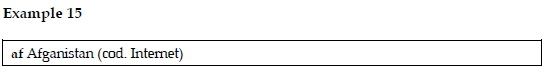 In example 15 we notice the appearance of additional information in brackets, i.e. (cod. Internet), codice Internet, in English internet code.