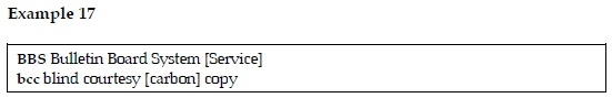 As seen in example 17 within the entries we also notice some cases where square brackets are used, i.e. [Service] and [carbon]. The function of the square brackets is to give the reader the information that both words are used, namely system and service within the expansion of the abbreviation BBS and carbon and courtesy within the expansion of the abbreviation bcc.