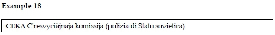 In example 18 we encounter a Russian abbreviation. The expansion is provided in Russian and is followed by an explanation in brackets (polizia di Stato sovietica) stating that it is the denomination of (militia in the Soviet Union).