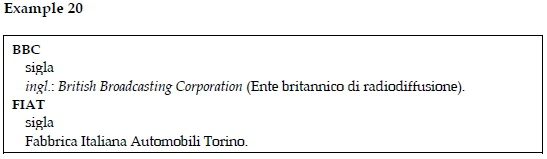 As seen from example 20 the dictionary entry is simple, composed of the headword written in bold and followed by the denomination sigla, in English abbreviation.1Within the dictionary entry the language qualifiers are included, i.e. ingl., inglese (English) abbreviated and written in italics and followed by colon and the expansion. Foreign expansions are written in italics and followed by the explanation or translation in brackets, Italian expansions are not written in italics and there is no description or additional information given.