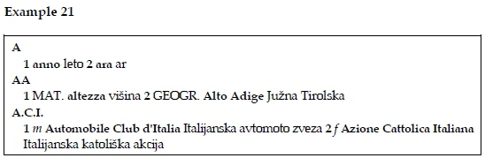 Within the bilingual encoding dictionaries, it is worth mentioning the Veliki slovensko-italijanski slovar (Slenc 2006) where we do not encounter abbreviations, except for lexical and linguistic ones, i.e. ital., (Italian). More abbreviations are encountered in the bilingual decoding dictionary Veliki italijanskoslovenski slovar (Slenc 1997) where in the appendix we find a list of approximately 1,000 abbreviations. The dictionary entry is simple, as seen in example 21 the expansions written in bold are alphabetically ordered and introduced by Arabic number in bold and followed by the Slovene translations. In the dictionary entry AA we notice the occurrence of abbreviated field qualifiers, i.e. MAT. (mathematics) GEOGR. (geography) prior to the expansion. In the dictionary entry A.C.I. we also notice the occurrence of gender denomination prior to the expansions, i.e. f, for femminile, (feminine) and m, for maschile, (masculine).