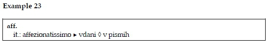 In cases as demonstrated in example 23, the Italian expansion affezionatissimo, in English very fond, is followed by the Slovenian translation vdani, in English devoted, and after the symbol ◊ also an explanatory sentence, v pismih, in English in letters, which explains the usage of the abbreviation in correspondence.