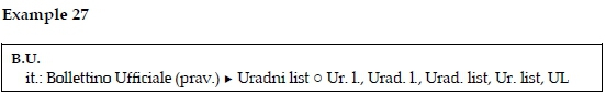 In example 27 there is more than one Slovene equivalent abbreviation present, in such cases all cross-references are included as separate dictionary entries. The entry is simple, composed of language qualifier, followed by the Italian expansion and field qualifier in brackets, the Slovene translation is provided after the symbol ► and the Slovene equivalent abbreviations after the symbol o.