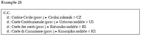 In example 28 we notice the occurrence of a series of Italian alphabetically ordered expansions that are accompanied with the abbreviated Slovene field qualifiers in brackets, i.e. (prav.), pravo in English law. The list of field qualifiers is provided prior to the dictionary prefaces. Due to the fact that all concepts of the Italian expansion also exist in Slovene, the translations are introduced with the symbol ► and followed by the official Slovene translations. Following the translations and introduced by the symbol o are the Slovene equivalents of the abbreviations, namely CZ, US, RS, and KS. Within the Slovene part of the dictionary the cross-references of the previously mentioned Slovene abbreviations are provided among the dictionary entries.