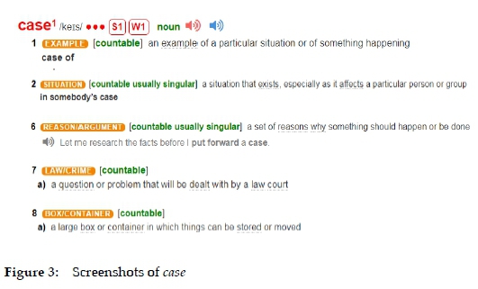 After the desired target collocation is located, the next step is to interpret. Previous studies (Li and Xu 2015, Chen 2017, 2020) proved that dictionary users have difficulty in understanding the meaning of collocations, especially in distinguishing different collocations related to a same headword. Therefore, the participants were given the following advice. Firstly, learn to distinguish word senses within a polysemous entry. Take drop a case (撤销诉讼) for example. Case has several different senses, some of which have a signpost at the very beginning of each sense for users to capture its meaning, like EXAMPLE, SITUATION, REASON/ARGUMENT, LAW/CRIME, BOX/CONTAINER (see Figure 3). The participants were instructed to read all the signposts, compare different senses and choose the one which fits the given context in the sentence.