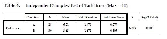 The data for this part were collected from the test paper. An independent samples T-test was conducted to compare task scores from Conditions A and B. As Table 6 shows, the students in Condition A obtained an average of 6.21 correct verbs from the dictionary while those in Condition B made only 3.63 right responses to the ten target collocations. A significant difference was identified (p < 0.001). In other words, dictionary use with prior training yielded significantly better task performance than autonomous dictionary use.